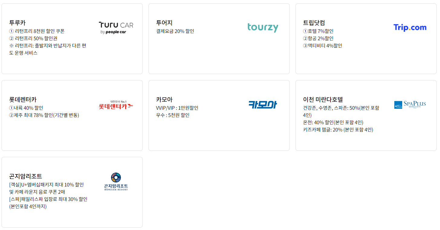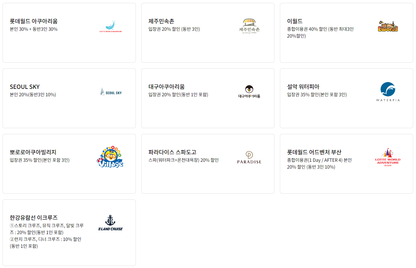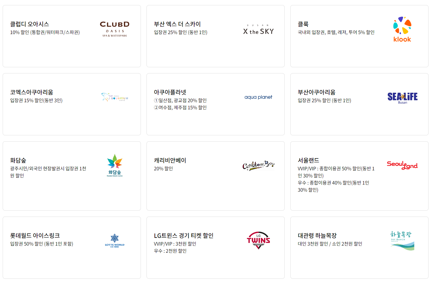 - 클럽디 오아시스, 부산 엑스 더 스카이, 클록, 코엑스아쿠아리움, 아쿠아플라넷, 부산아쿠아리움, 63 아트 전망대, 화담숲, 캐리비안베이, 서울랜드, 롯데월드 아이스링크, LG트윈스 경기 티켓 할인, 대 관련 하늘목장, 롯데월드 아쿠아리움, 제주민속촌, 이월드, SEOUL 스카이, 대구 아쿠아리움, 설악 워터피아, 뽀로로 아쿠아빌리지, 파라다이스 스파도고, 롯데월드 어드벤처 부산, 한강유람선 이 크루즈