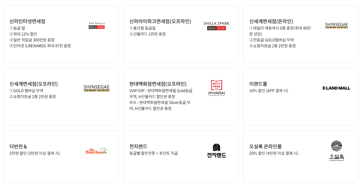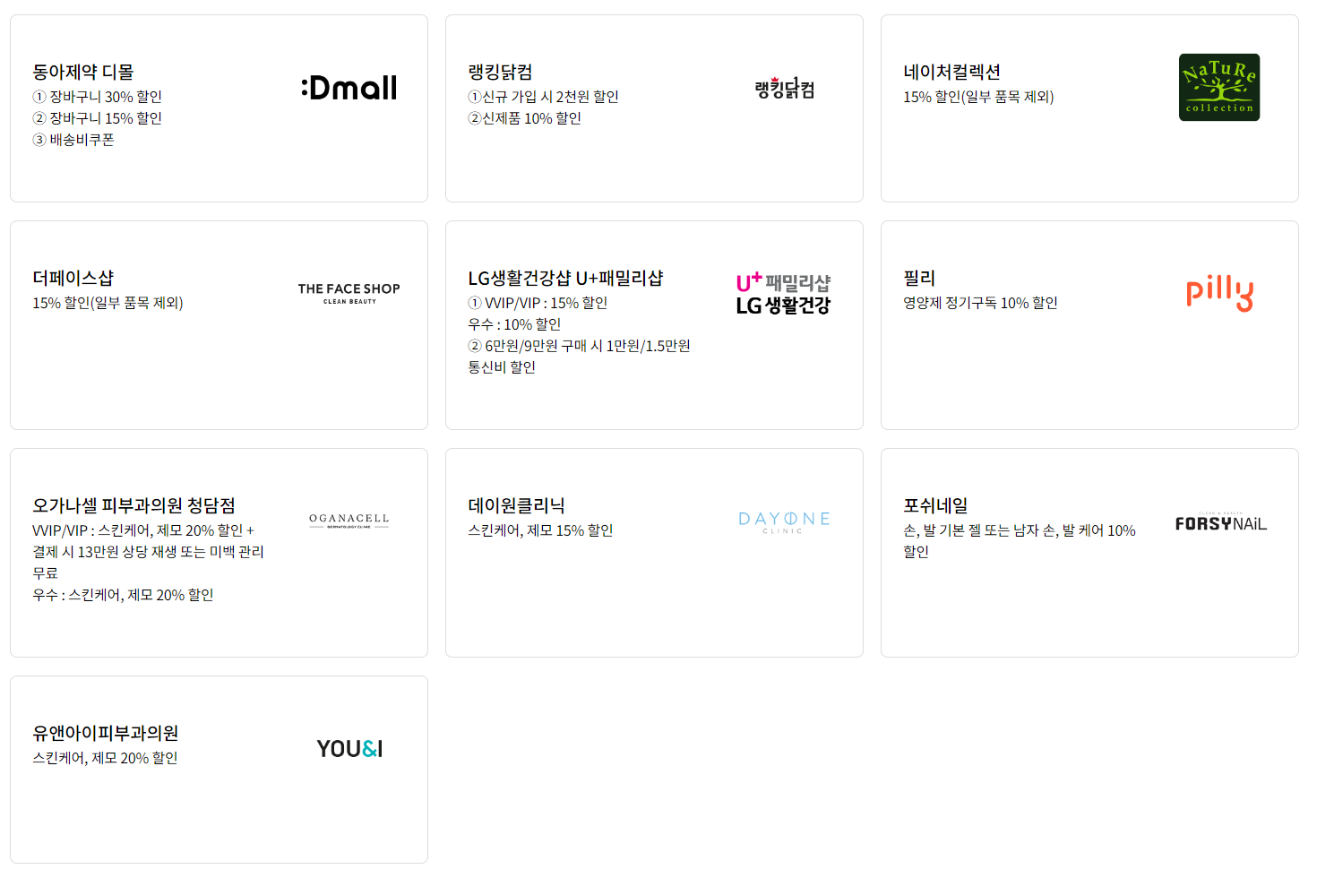 - GS THE FRESH, U+ 콕, 현대백화점면세점(온라인/오프라인), 셀렉스, 동원몰, 신라면세점(온라인/오프라인), 광동상회, 키디키디, LG전자샵 U+패밀리샵, AK mall, 롯데면세점(온라인/오프라인), 신라인터넷면세점, 신라아이파크면세점(오프라인), 이랜드몰, 더반찬&, 전자랜드, 오설록 온라인몰